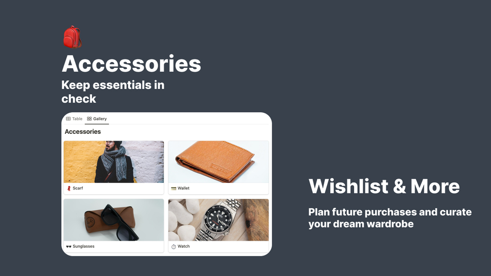 👕 Core Wardrobe Pieces: Track your everyday essentials and build your signature style.