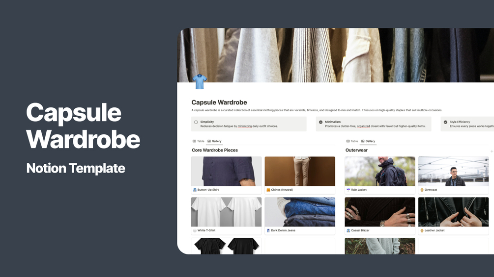 Looking to simplify your style and create a wardrobe that works for every occasion? This Capsule Wardrobe Notion Template is your all-in-one solution for building a curated, stylish, and minimal wardrobe. With interactive sections and plenty of inspiration, this template helps you stay organized and intentional about your fashion choices.