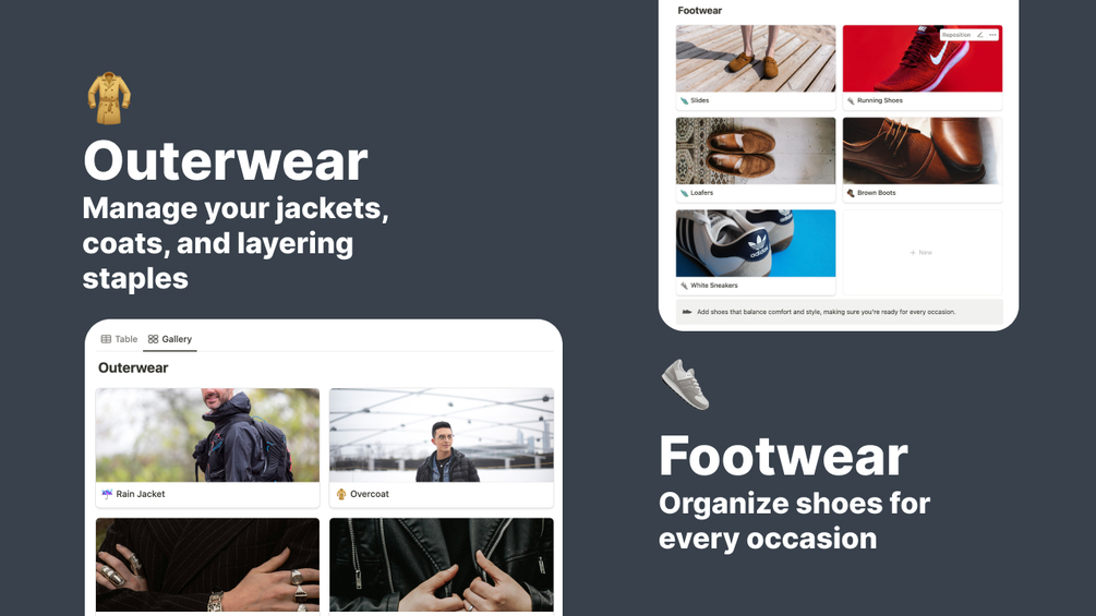 🧥 Outerwear: Manage your jackets, coats, and layering staples by season.