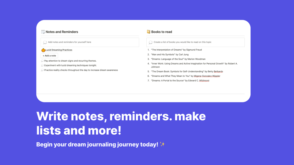 📋 Make Lists: Create lists to explore patterns, recurring dream elements, or books on dreams.